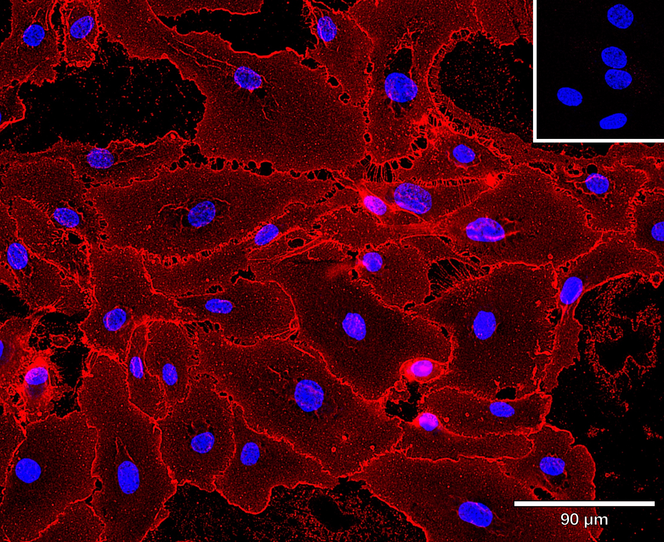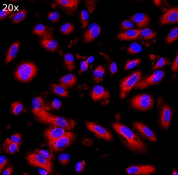 Image: Staining of key cytoplasmic marker, porcine Alpha-tubulin 1, on HUVEC cells by wide field microscopy. Detection with V5-tagged Ankyron, Porcine Alpha-tubulin 1-specific clone CS30561 and Anti-V5 labelled with APC (red), counterstaining nuclei with DAPI (blue).