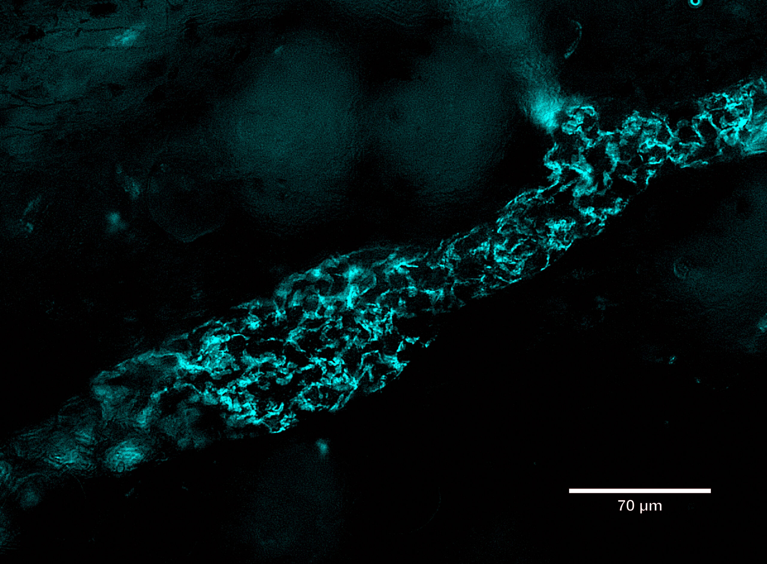 Using fluorescence microscopy, LYVE1 was detected in cyan at the overlapping flaps of endothelial cell junctions in skin tissue. The breakthrough lies in the ultra-compact size of Ankyrons—approximately one-tenth the size of traditional monoclonal antibodies (~15 kDa)—which allows them to navigate and label tight cellular junctions with high precision. This enables detailed mapping of endothelial structures previously difficult to access.